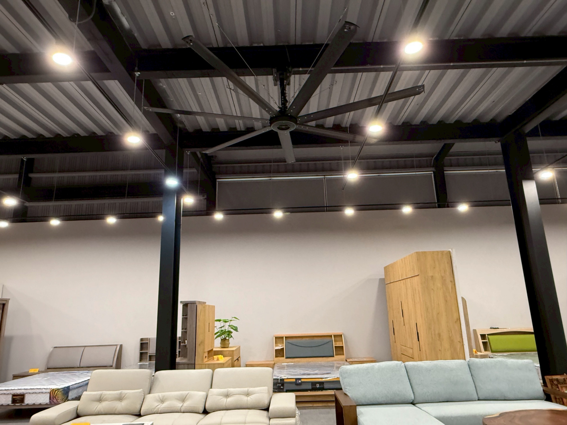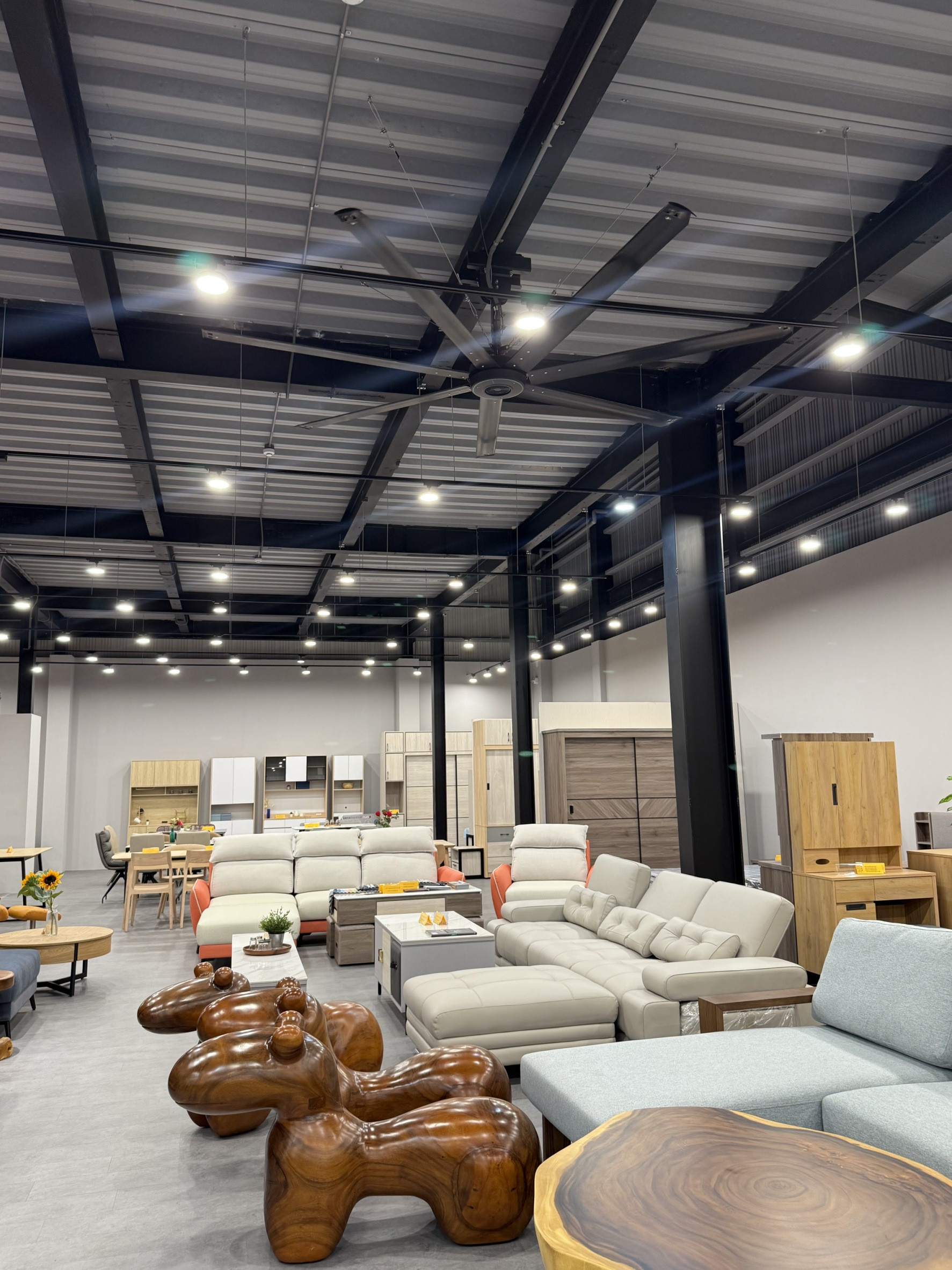 位於楊梅的某家具、寢具展售中心,為了打造舒適又具設計質感的選購環境,在全新裝潢的展售中心導入了 建準 SUNON Powerful HVLS Fan Series 3,打造涼爽又美觀的空間通風體驗。