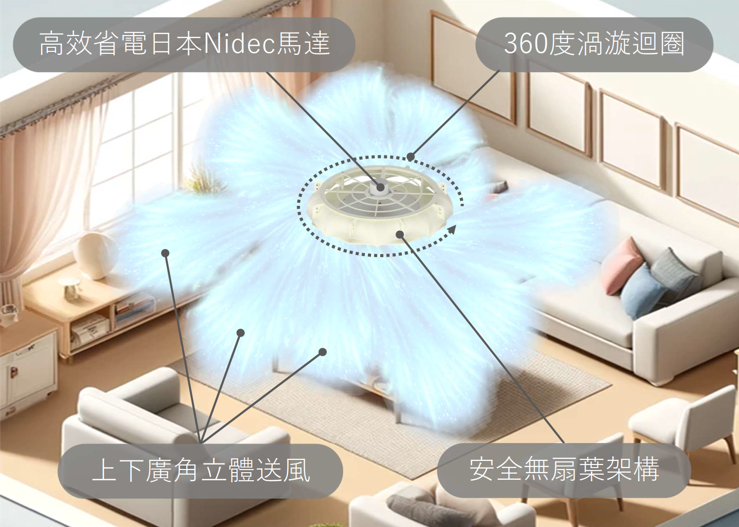-安全可靠的無扇葉架構,使⽤者無法接觸扇葉,